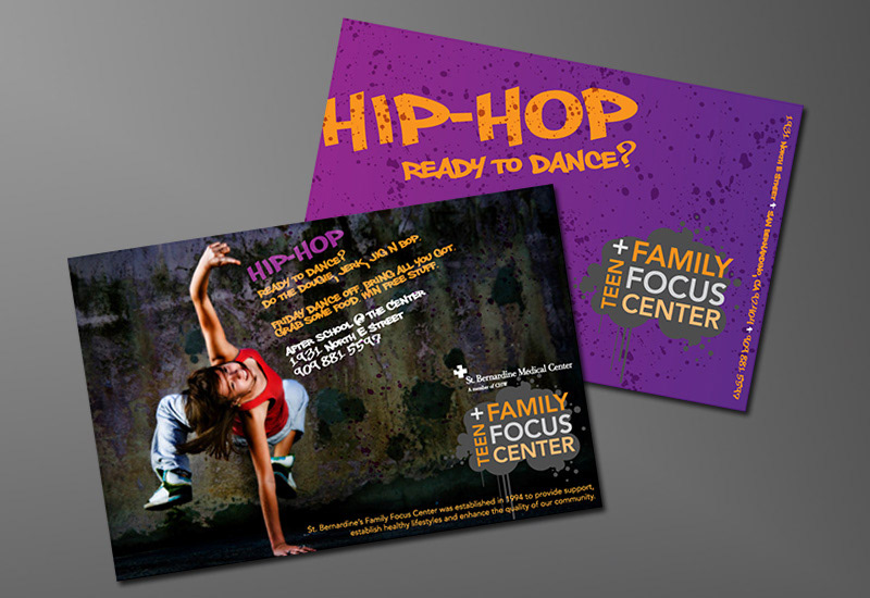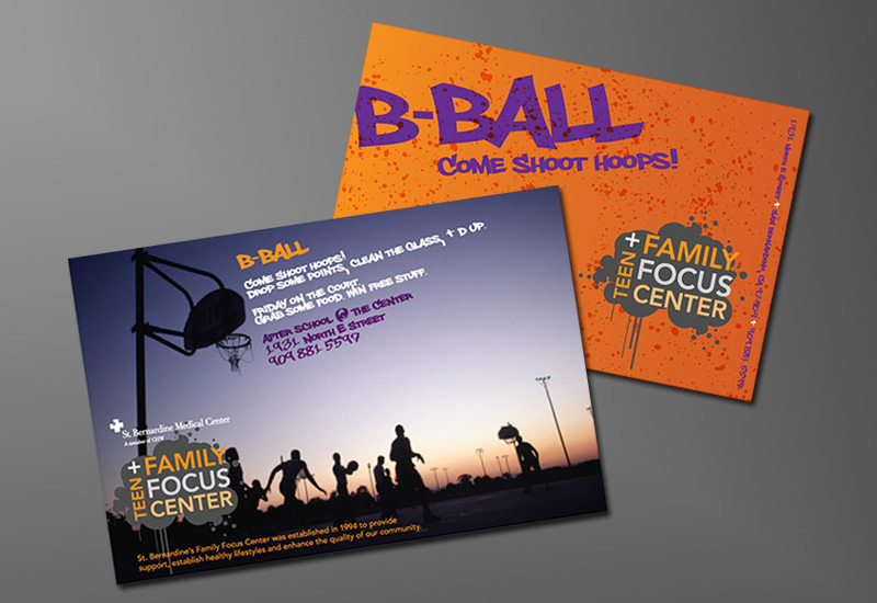 Promotional postcard size hand-outs to encourage youth to attend St. Bernardine Medical Center's Teen + Family Focus Center. The Center sponsors events such as weekly basketball games and Friday night dance parties.
